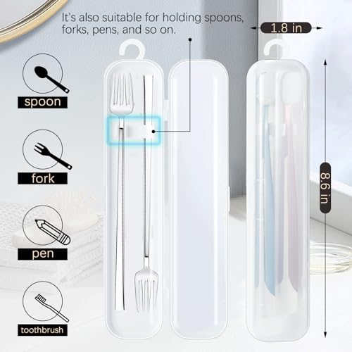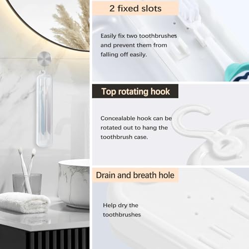 Details: Upgraded Toothbrush Travel Case Are you still worried about not having a clean place to store your toothbrush when you go out? Not a problem anymore to use our portable organizer case. This storage organizer is a great way to sort your oral supplies. The holder grooves hold toothbrushes, toothpaste and dental floss with ease. The sealed lid keeps your items clean and anti-dust. The rotating hanger on the back of the toothbrush case allows you to hang the case to take advantage of vertical space . Also fits in most drawers. Keep your essentials organized and tidy. Specifications: Color: White & Transparent Size: 8.6" (L) x 1.8" (W) x 1.1" (H) Material: High quality PP eco material Notice: 1. Note: Toothbrush storage case holder does not come with toothbrush, toothpaste or towel 2. If there is any quality problem of the product itself, do not hesitate to contact us immediately. Package Includes: - The toothbrush travel case * 2