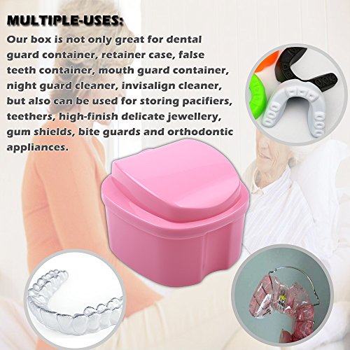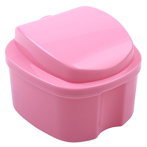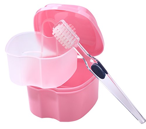Bearals Denture Box, Denture Cup, Denture Case with Brush, Denture Bath Cleaning Soaking Cup with Strainer, Mouth Guard Night Gum Retainer Container (Pink)