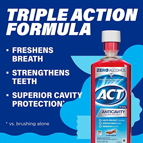 ACT ANTICAVITY ZERO ALCOHOL FLUORIDE MOUTHWASH 18 FL. OZ., WITH ACCURATE DOSING CUP, CINNAMON: PROTECT YOUR TEETH WITH ALCOHOL-FREE FLUORIDE MOUTHWASH
