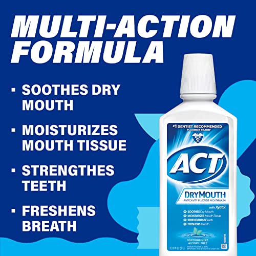Soothe dry mouth and promote a healthy mouth and teeth** with ACT Dry Mouth Anticavity Zero Alcohol Fluoride Mouthwash, Soothing Mint. Formulated with xylitol to soothe dry mouth and moisturize mouth tissue, this fluoride mouthwash is also designed to help prevent cavities, strengthen teeth and freshen breath. Best of all, this dry mouth mouthwash comes in a Soothing Mint flavor that keeps your breath feeling fresh. When it comes to happy smiles, trust the No. 1 dentist recommended fluoride brand*. *Among mouth rinses **As part of a regular dental hygiene routine that includes brushing, flossing, and rinsing with a fluoride mouthwash