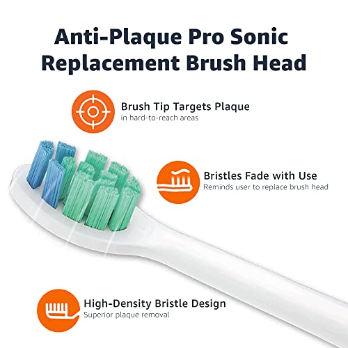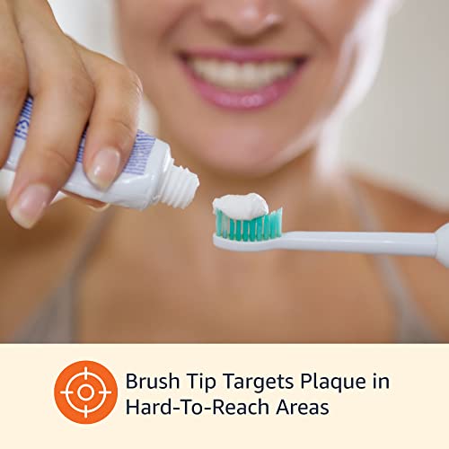 Details: Product Description Get the smile you deserve with Amazon Basics Replacement Brush Heads. Our full size brush heads remove up to 7X more plaque than an average brush head and are great for targeting hard-to-reach areas between teeth. The high-density bristle design provides superior plaque removal and the blue Replace-Me bristles fade with use to remind you when to replace your brush head. These replacement brush heads are made to fit the Amazon Basics Anti-Plaque Pro Sonic Rechargeable Toothbrush and most Philips Sonicare Click-On Electric Toothbrushes. Includes one 3-count package of Amazon Basics Anti-Plaque Pro Sonic Replacement Brush Heads. For optimum hygiene, replace your toothbrush heads every 3 months. Because happy teeth make for a clean, bright smile. From the Manufacturer Amazon Basics