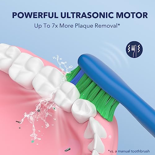 • 【Powerful Sonic Cleaning & 2-Mins Timer】--- Recommended by professional dentists --- [1] Ultrasonic toothbrush packed with the most up to date sonic technology for exceptional clean and remove up 7X plaques. It features a industry leading motor producing 40,000 vibrations per minute, can reach deep areas in the mouth that traditional toothbrushes may miss. [2] Built in smart timer control, 30 seconds interval reminding you to move to the next quadrant of your mouth, and totally in 2 minutes.