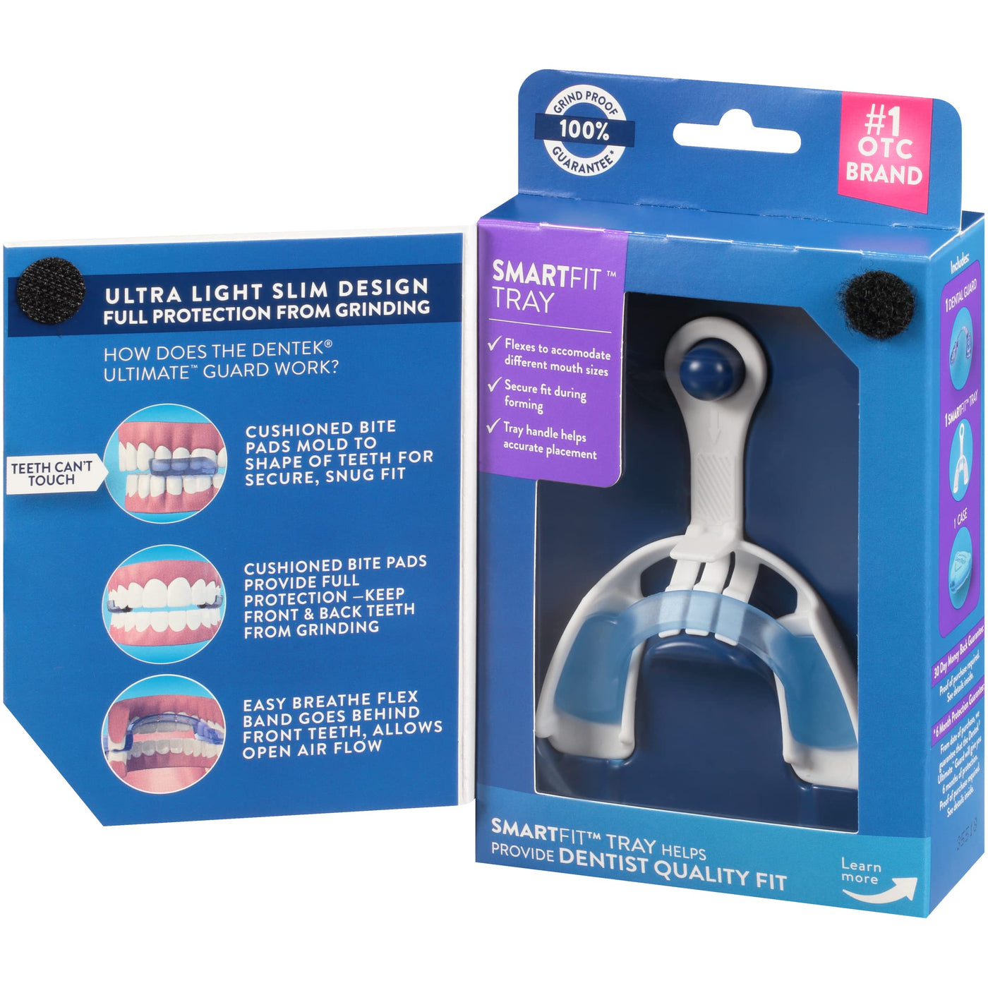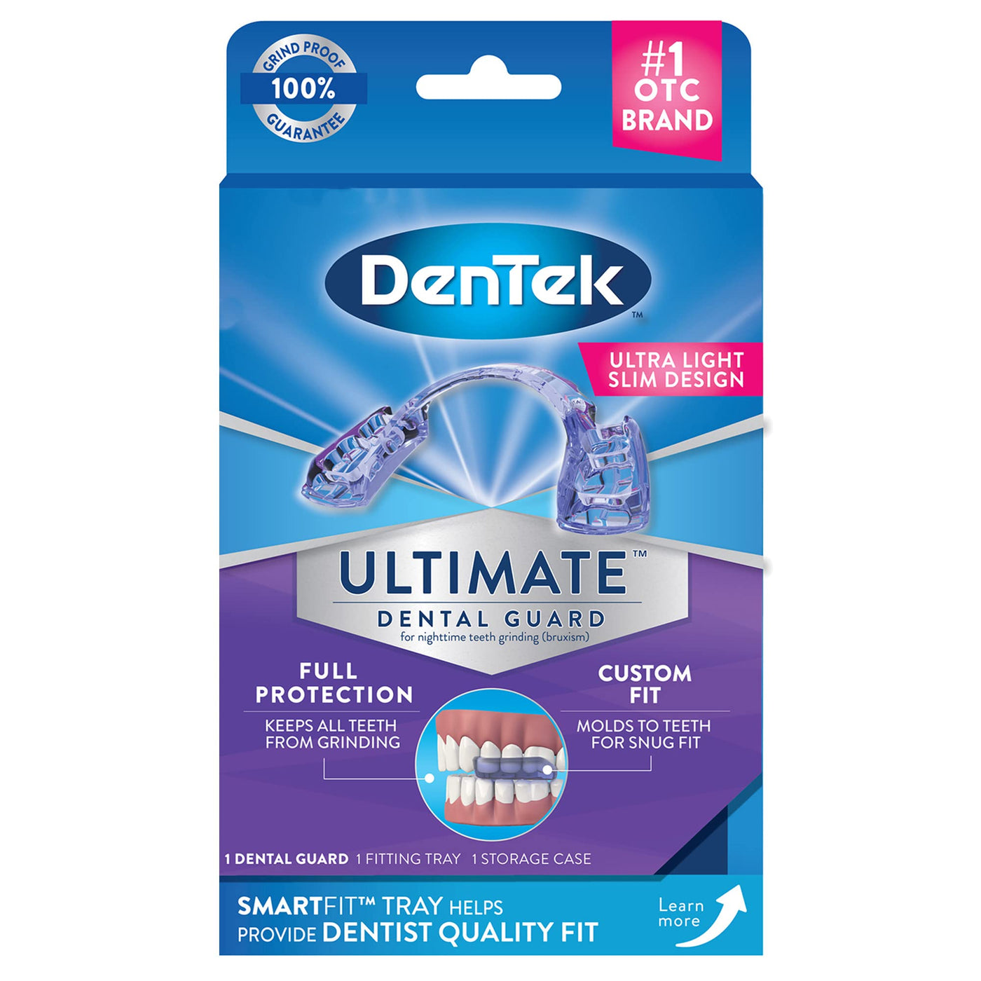 Details: DenTek Ultimate Guard fits the front and back teeth and comes with a SmartFit Tray to help provide a dentist-quality fit like a full coverage guard. Quickly customize the DenTek Ultimate Dental Guard in 3 easy steps. Read all instructions inside the package and watch the full video before fitting the DenTek Ultimate Dental Guard. All parts are BPA free. DenTek Ultimate Dental Guard will give you 6 months of guaranteed protection from the date of purchase (1). DenTek is the Number One OTC dental guard brand for nighttime teeth grinding (2). Teeth grinding, also known as bruxism, is when a person clenches their jaw and the upper and lower teeth scrape and grind against each other. This Guard helps to prevent conditions caused by teeth grinding including jaw discomfort, tooth chipping and cracking, and headaches. DenTek is also ranked best mouth guard for daytime grinding (3). Go beyond brushing with DenTek! Help preserve and protect your natural teeth for a lifetime with DenTek's innovative dental care products. FSA- and HSA-eligible product in the U.S. (1) Proof of purchase required (2) Source: IRI Data Total Units Sold Ending 09.06.20 Multi-Outlet and Convenience Store (3) New York Magazine 2021