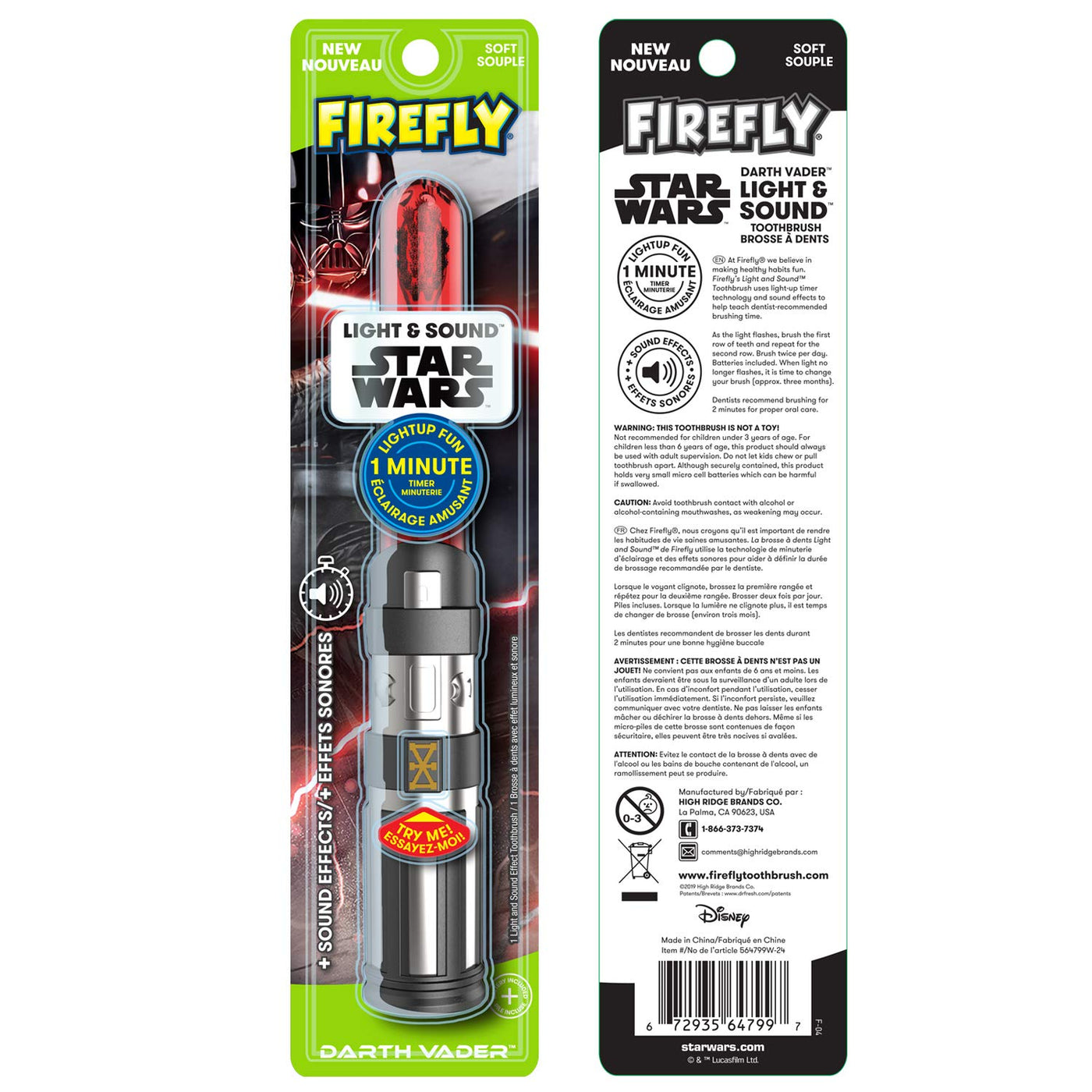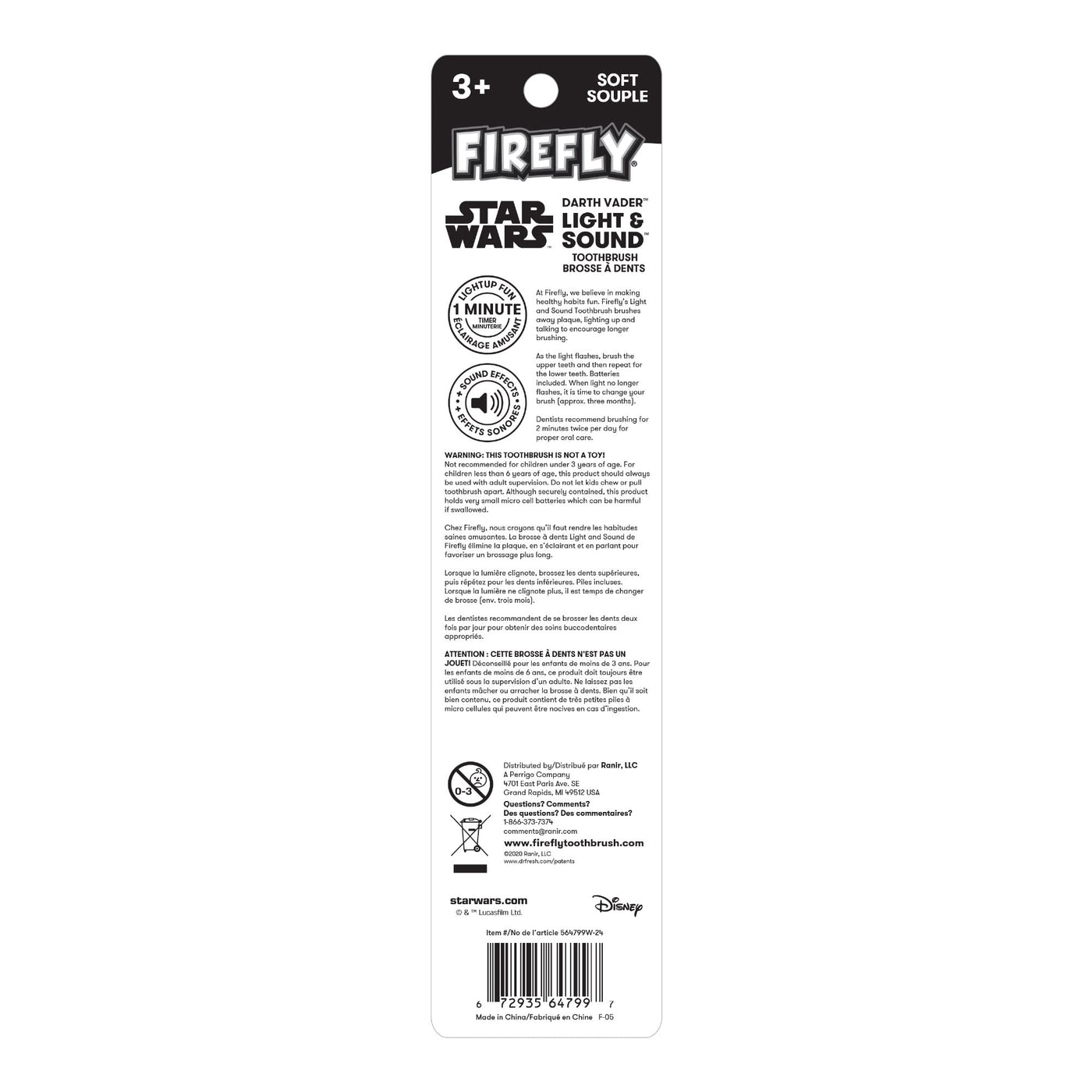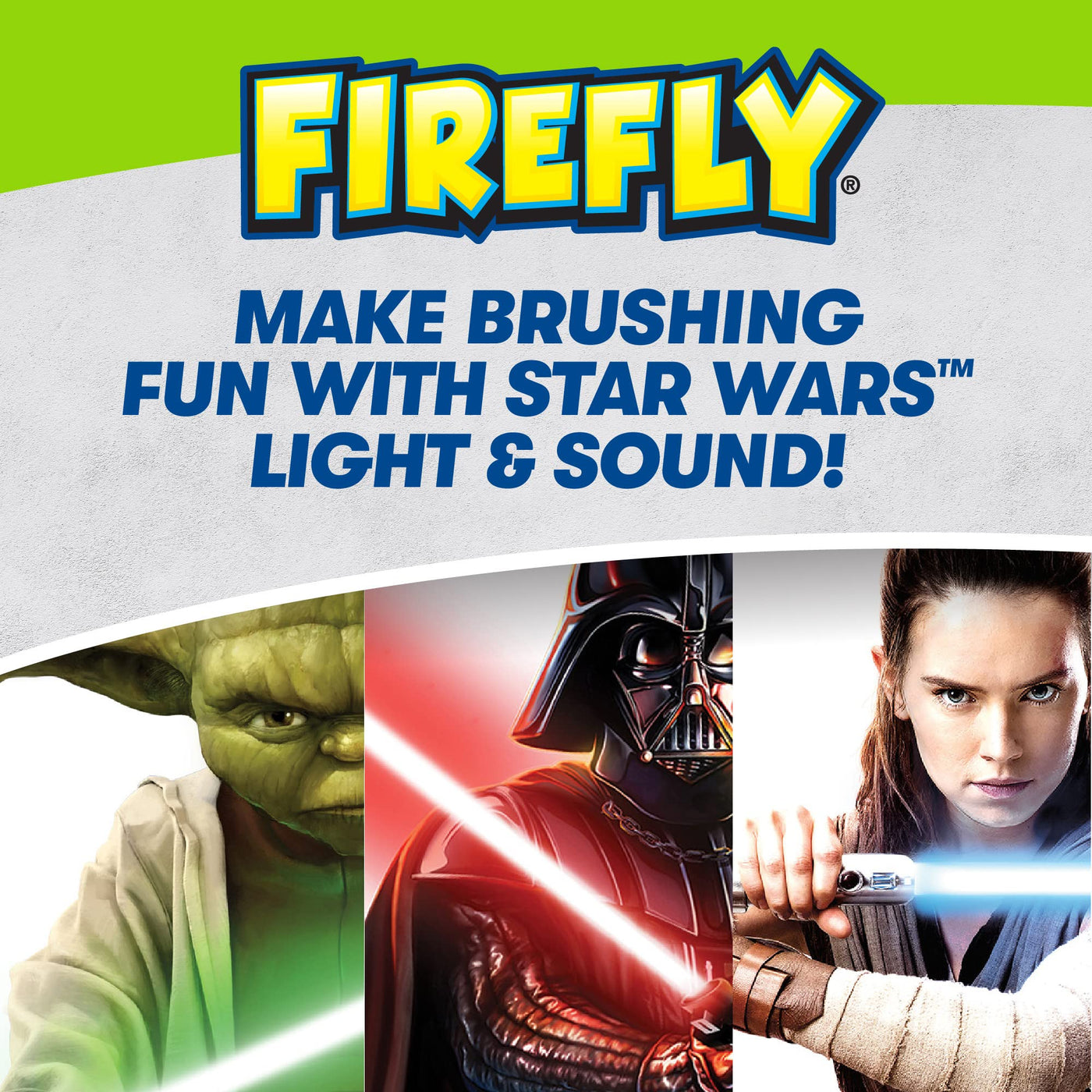 Know the power of The Force with the Firefly Star Wars Kylo Ren and Rey Lightsaber children's toothbrushes! This lightsaber toothbrush features soft, rounded, premium DuPont bristles so they are gentle on children's teeth while providing a thorough cleaning. The 1-minute light-up timer and sound effects help build healthy brushing habits and teach kids the dentist-recommended time for proper cleaning of each row of teeth. The ergonomic handle makes this lightsaber fun and easy to use. Firefly makes healthy habits fun!