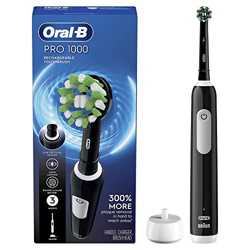 Product Description The Oral-B Pro 1000 rechargeable electric toothbrush provides a clinically proven superior deep clean in hard-to-reach areas vs. a regular manual toothbrush. 300% MORE plaque removal along the gumline versus a regular manual toothbrush. The professionally inspired design of the CrossAction brush head surrounds each tooth with bristles angled at 16 degrees. The Oral-B Pro 1000 has 3D cleaning action that oscillates, rotates, and pulsates to break up and remove plaque along the gumline than a regular manual toothbrush. The pressure sensor stops pulsations if you brush too hard to prevent harmful over-brushing and there are 3 modes. The toothbrush also includes an in-handle timer to help you brush for a dentist-recommended two minutes. Best of all, it is brought to you by Oral-B - the #1 brand used by dentists worldwide.* *Based on surveys of a representative worldwide sample of dentists carried out for P&G regularly. Do not use on children under age 3. Replace brush (head) every 3 months or sooner if brush head becomes worn. Manufacturer Contact Information P&G Plaza, Cincinnati, OH 45202