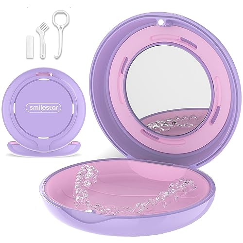 • USER-FRIENDLY DESIGN - Built-in mirror helps you easily put on and take off the retainer and check if food is stuck in your teeth. The food-grade silicone pad on the inside prevents the retainer from moving, protecting your holder and reducing rattling noise in pockets and purses. Package included: 1× cute purple retainer case, 1× retainer remover tool, 1× retainer chewie, 1× retainer brush.